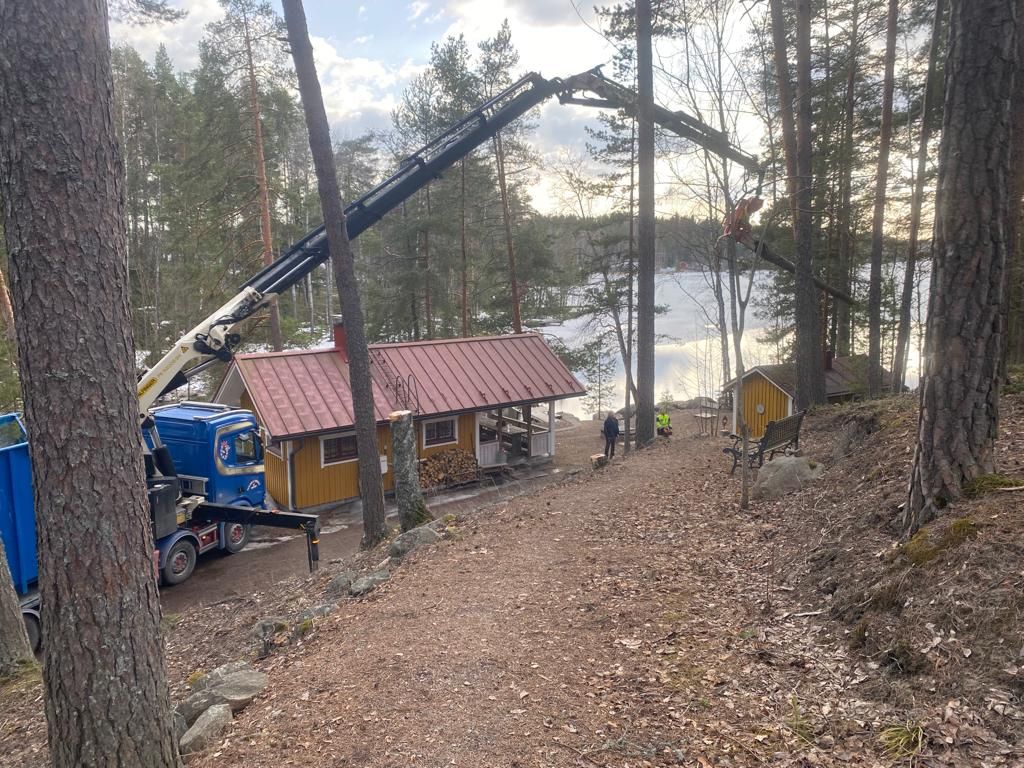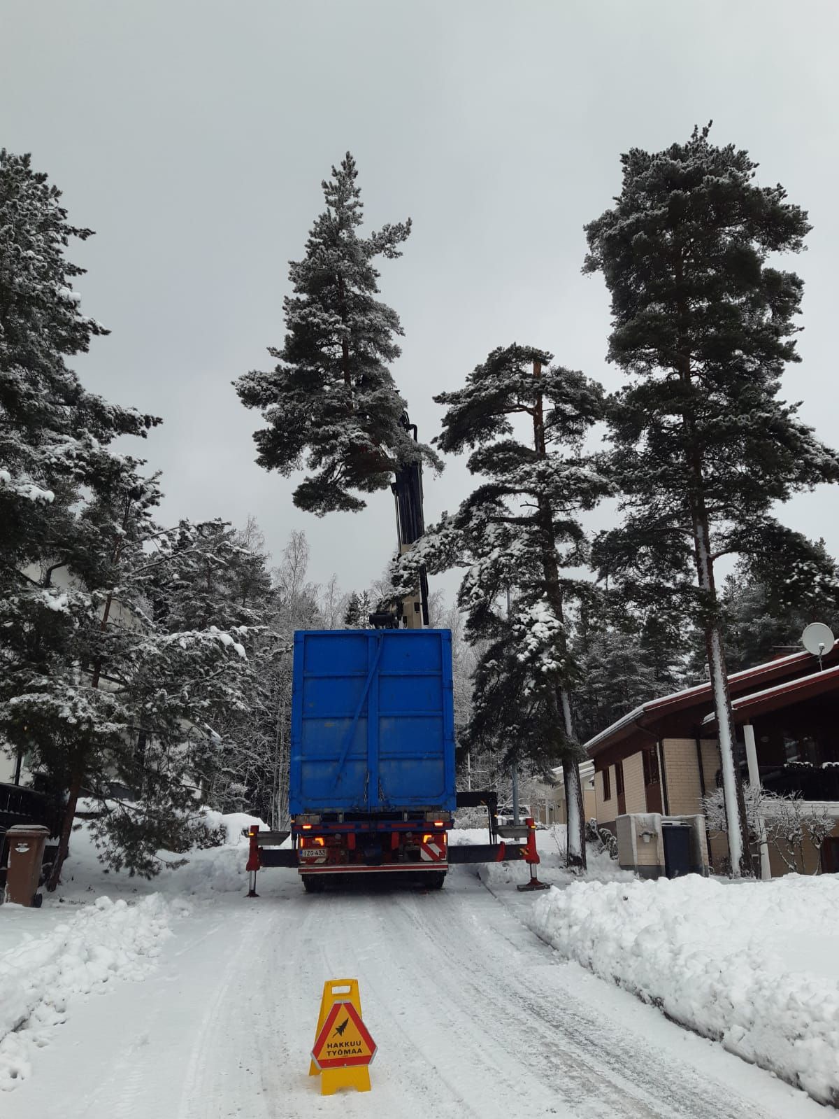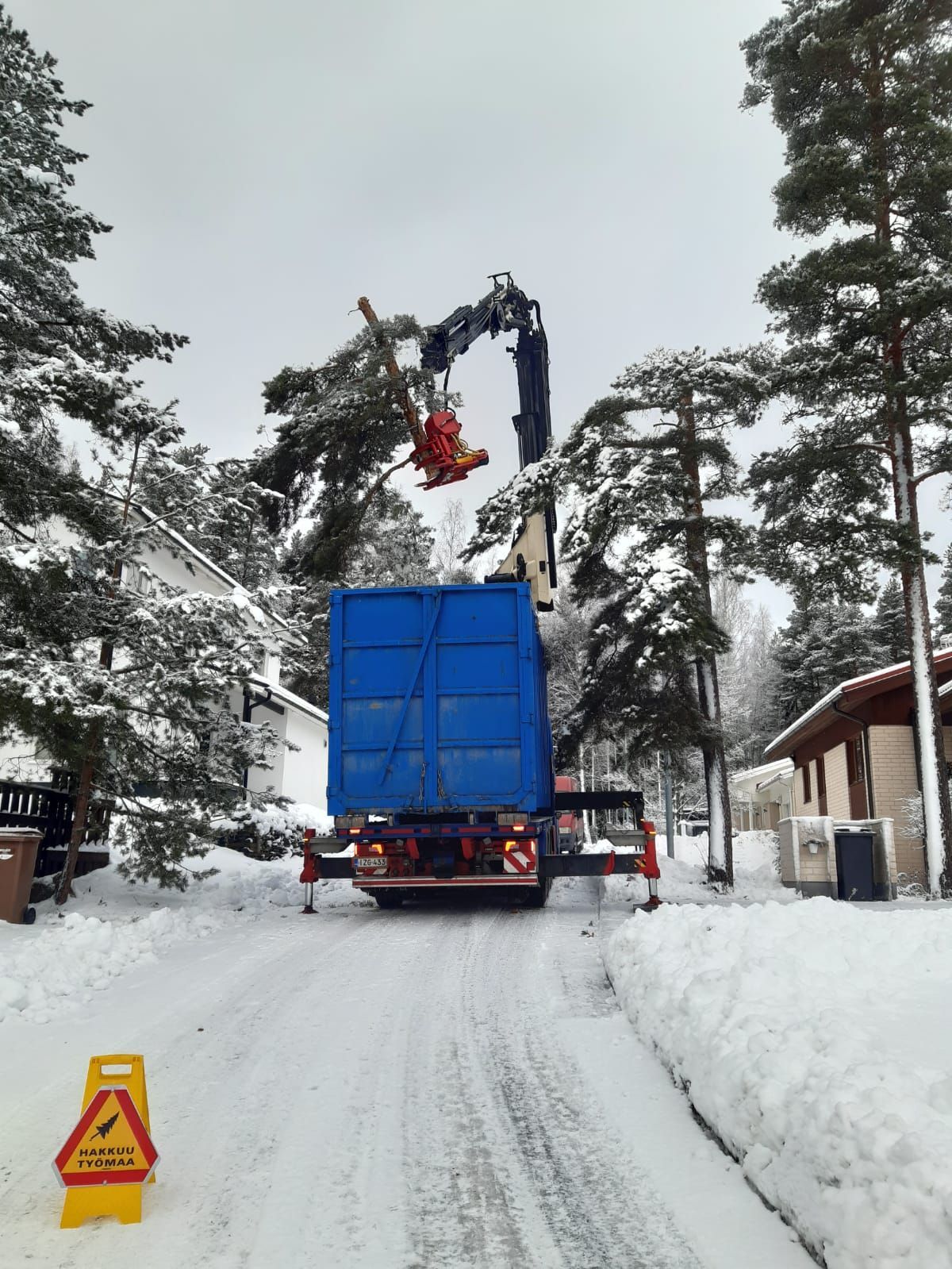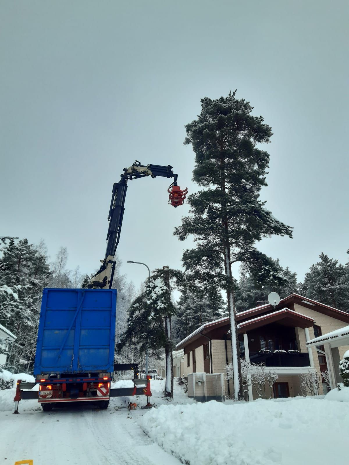 Nosturiautoomme on hankittu giljotiinikoura, jolla puita saa poikki ja pinoon sekä helposti lavalle poiskuljetettavaksi kinkkisemmistäkin paikoista. Ulottuvuutta on kolmisenkymmentä metriä ja koura ulottuu vaivattomasti poistamaan puita myös rakennusten yli.